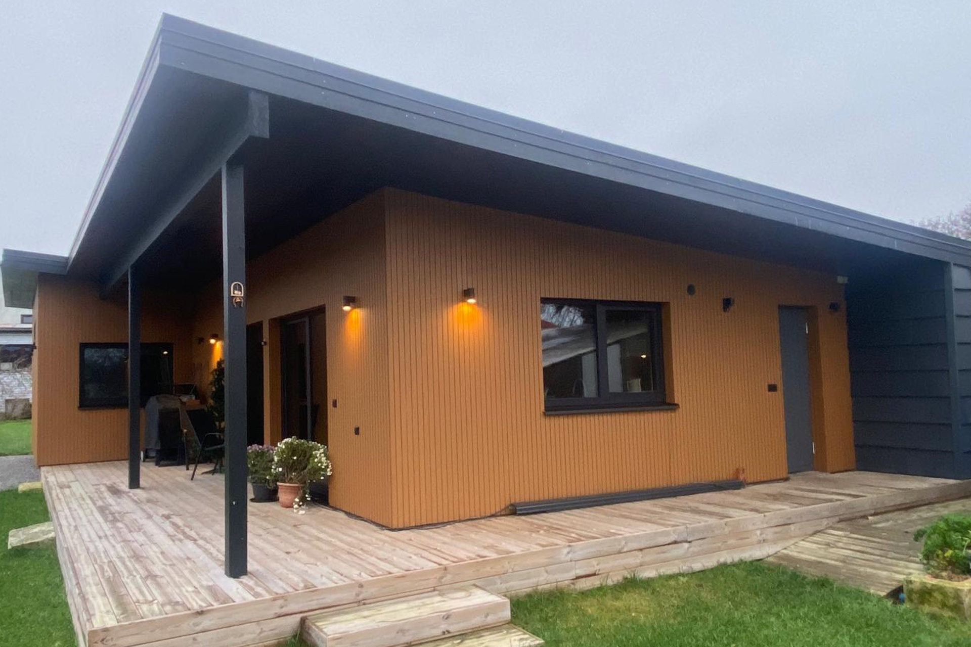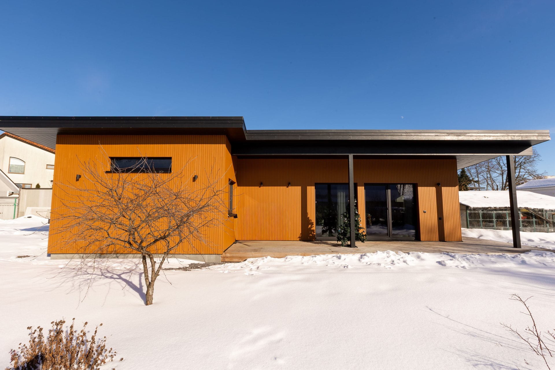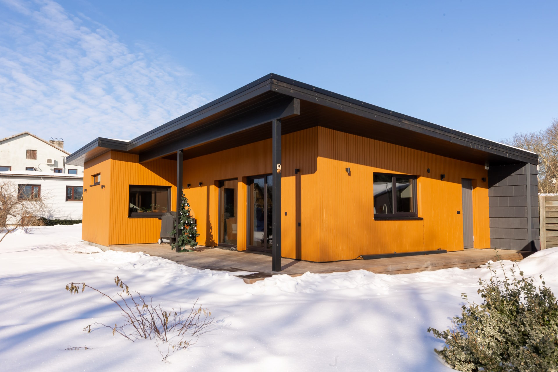 Hoone ümber on kavandatud avar puitterrass, mille kohal olev pikk räästas pakub kaitset nii vihma kui päikese eest. Tänu sellele saab terrassi kasutada mugavalt suure osa aastast.
