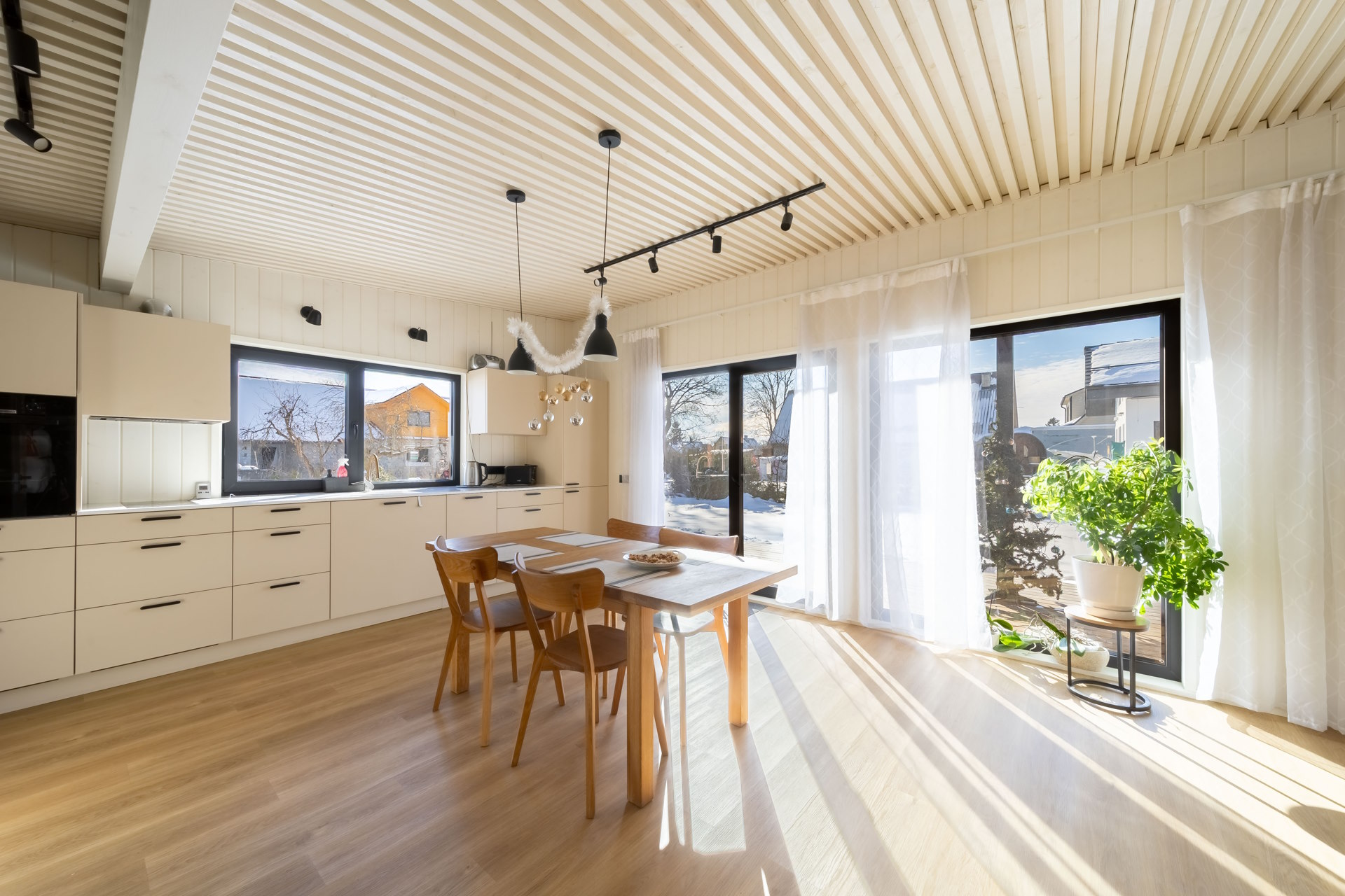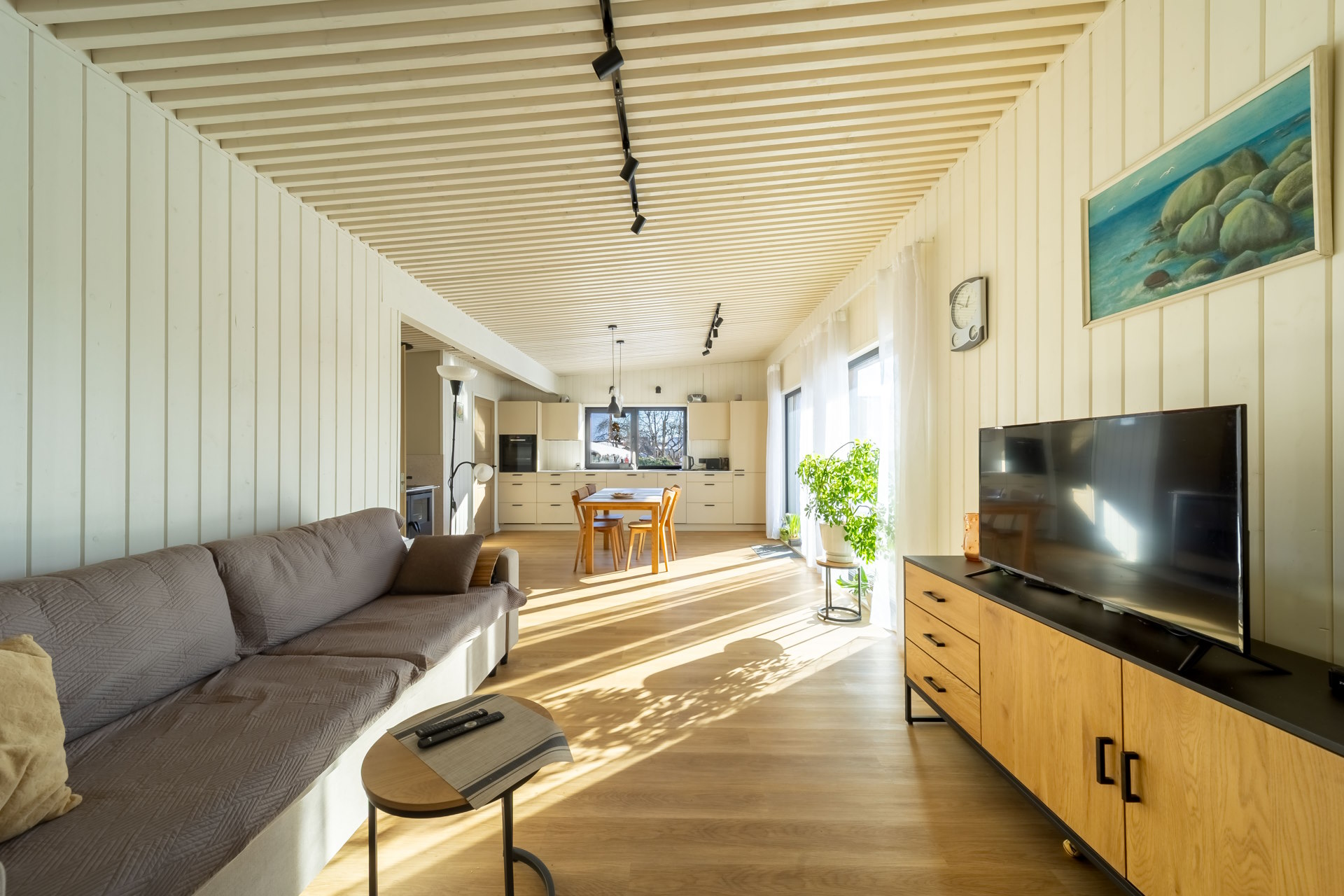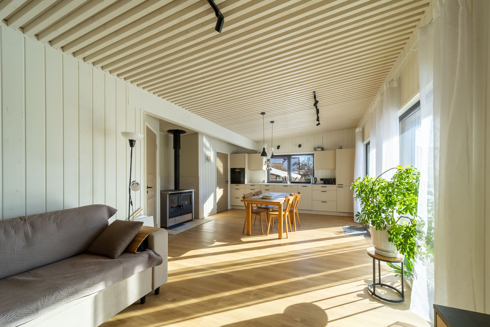Pärni on kompaktne ja läbimõeldud kodu, mis sobib ideaalselt väiksemale perele või teiseks koduks looduse keskel. Ühepoolse kaldkatusega hoone kõrgemasse ossa on planeeritud avar elutuba koos avatud köögiga, kus suured aknad toovad ruumi rohkelt loomulikku valgust. Samal ajal kaitsevad pikad räästad siseruume liigse päikesesoojuse eest.