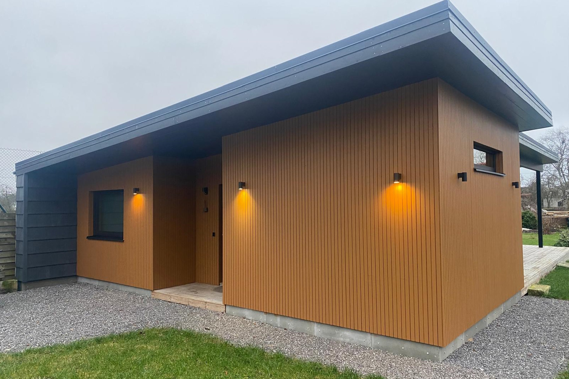 Hoone tarnitakse tehases valmistatud seinaelementidena, mis võimaldab kiiret ja täpset paigaldust.
